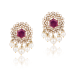 The Regalia Earrings showcase hexagon rubies paired with uncut diamond polki, brilliant rounds, and South Sea pearls. Set in 18K gold, they strike a rich balance of tradition and luxury.