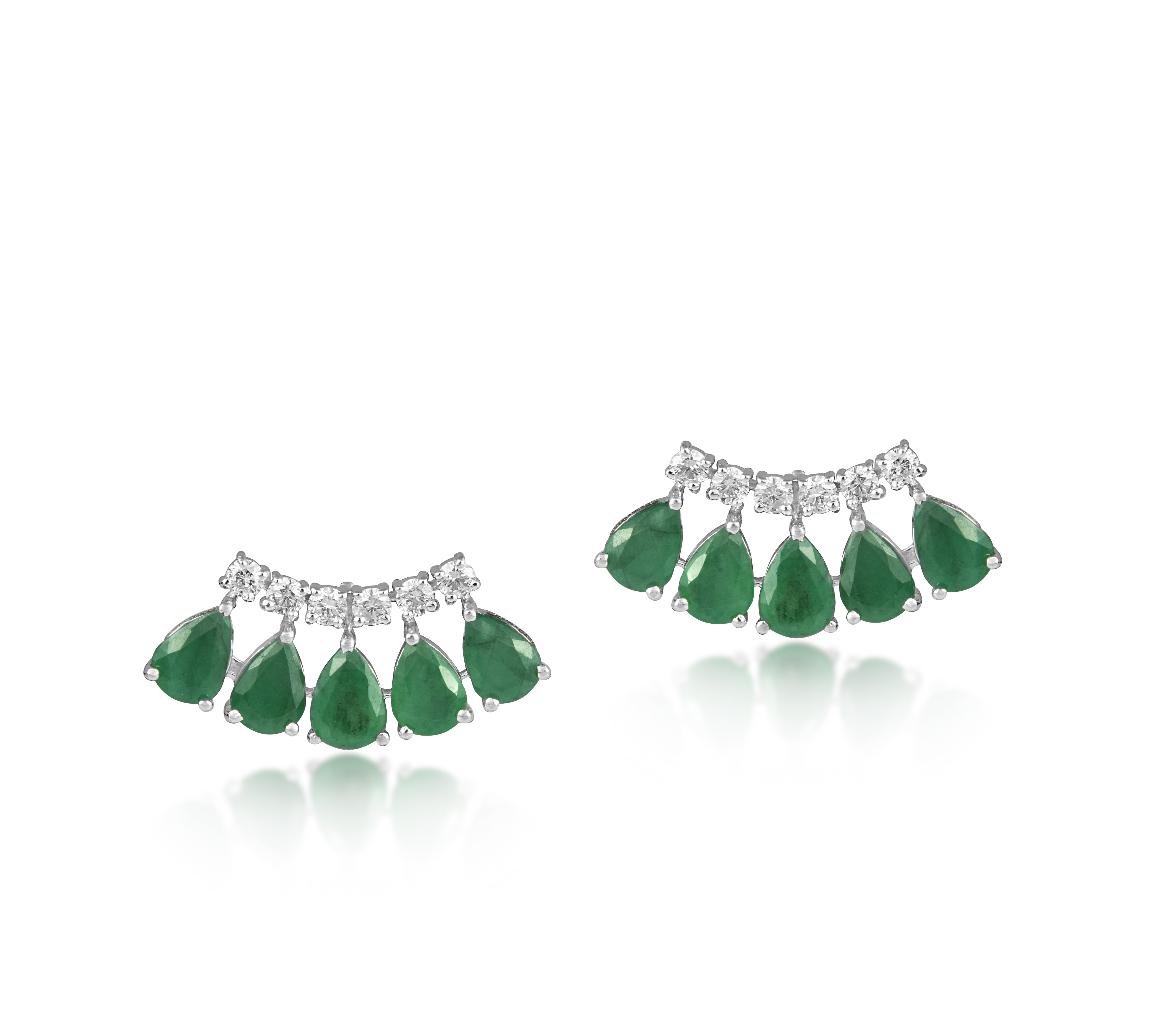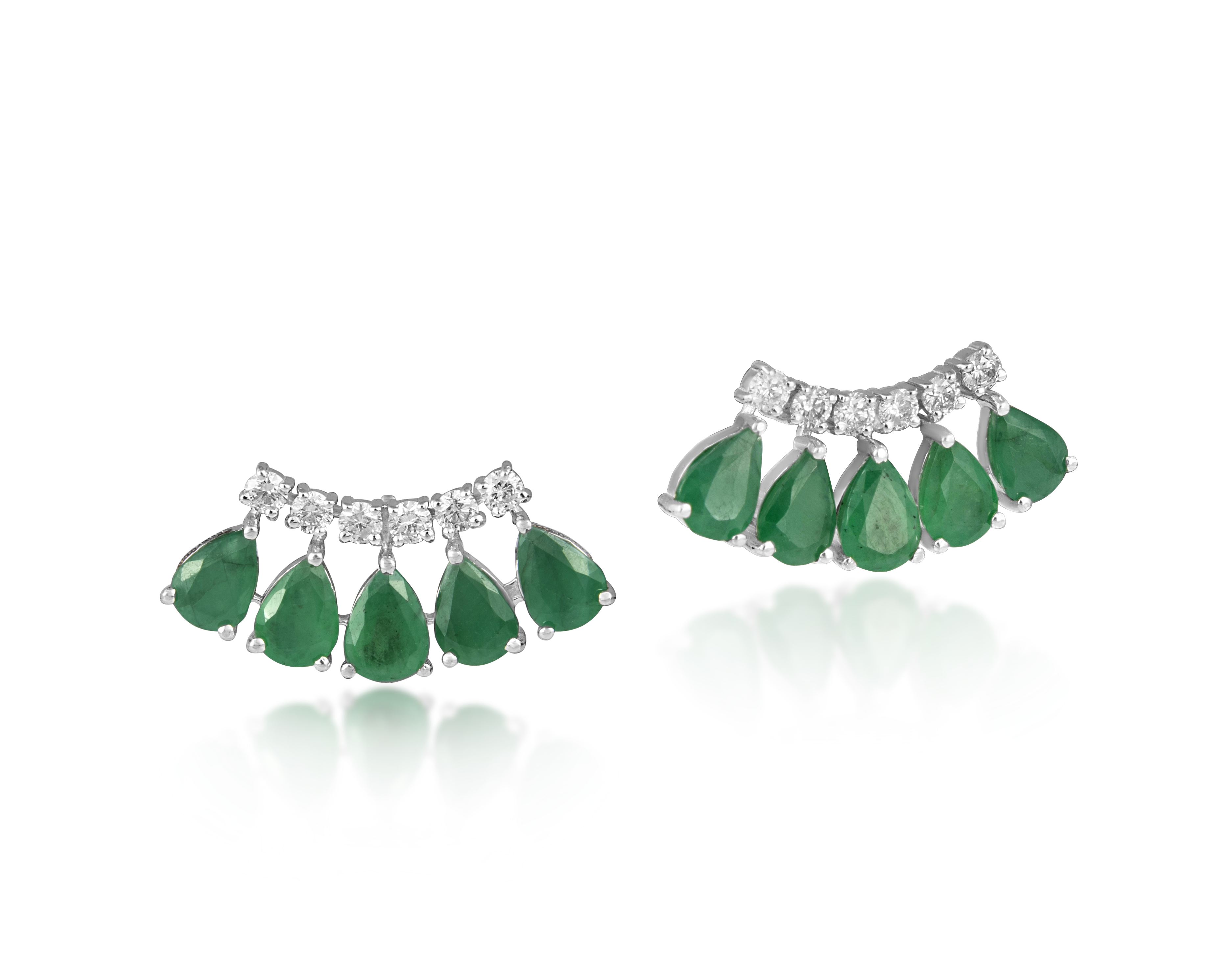 The Soraya Earrings feature pear-shaped emeralds matched with round diamonds. Set in 14K gold, they strike a balance of vivid color and simple sparkle, making them easy to pair for both daily wear and celebrations.