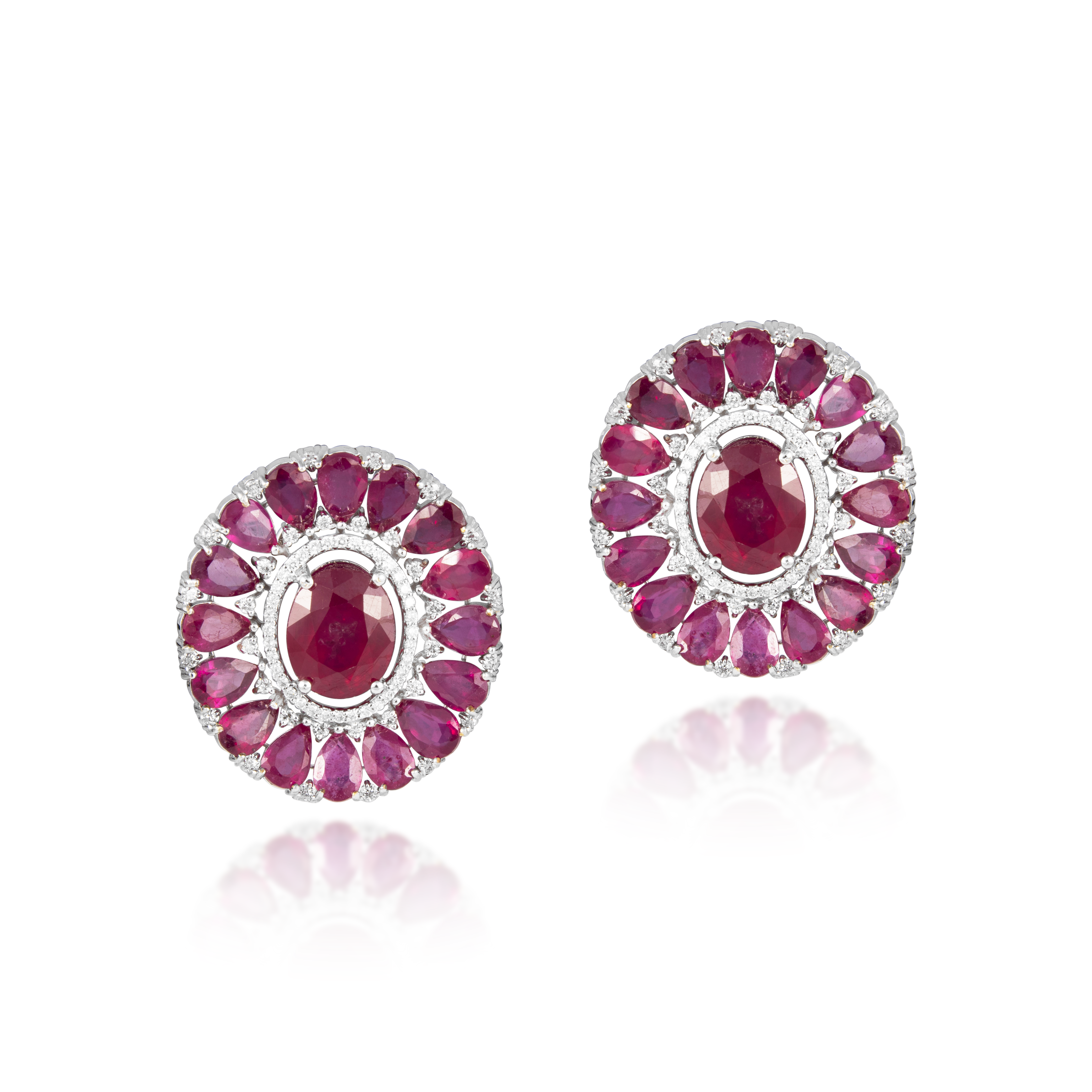 Pear and Oval Shaped Glass Filled Ruby Earrings With Natural Round Brilliant Diamond Set in 14 Karat Gold