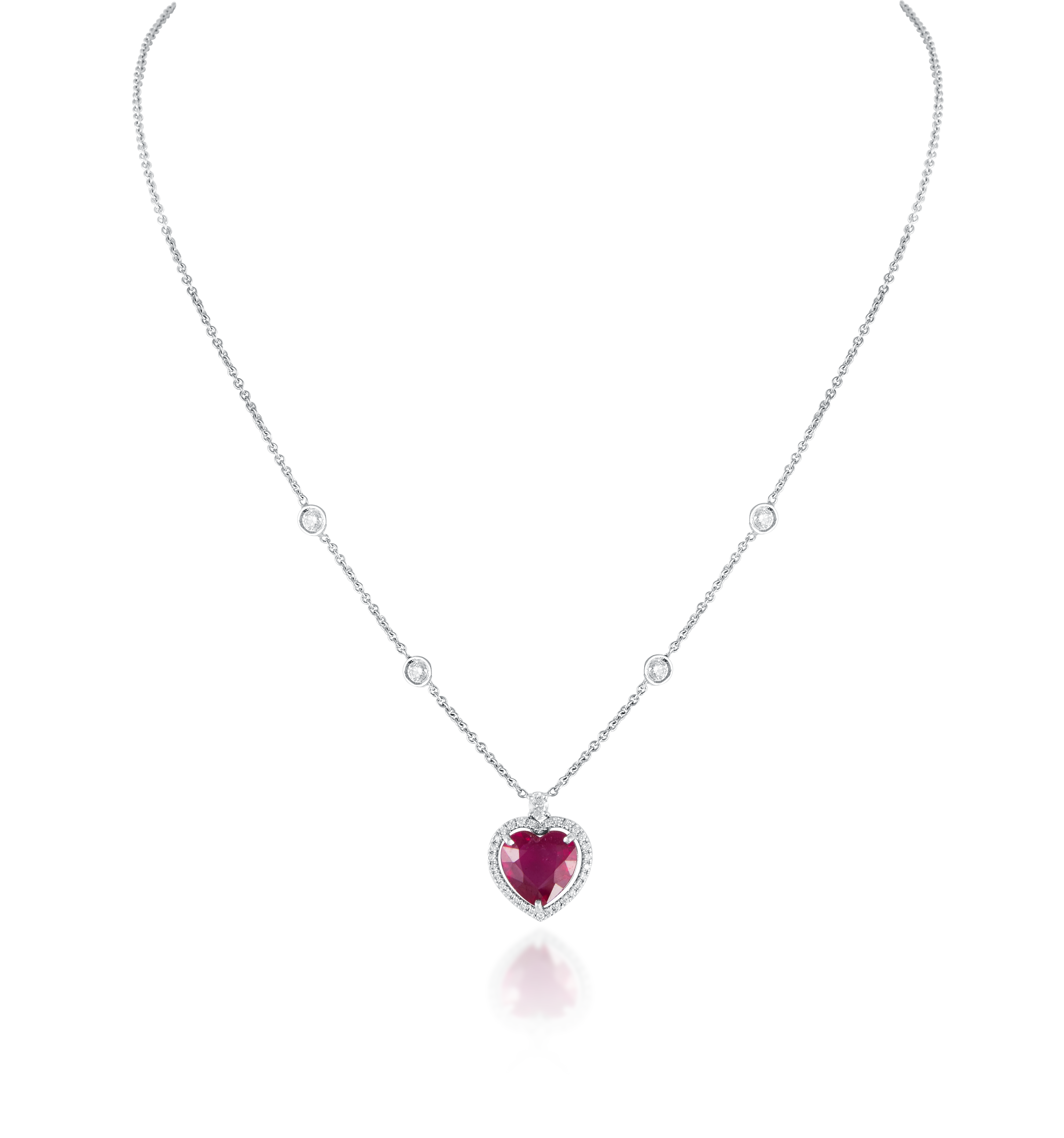 Heart Shape Glass Filled Ruby Pendant Necklace With Round Brilliant Natural Diamonds Set in 18 Karat Gold