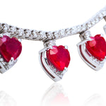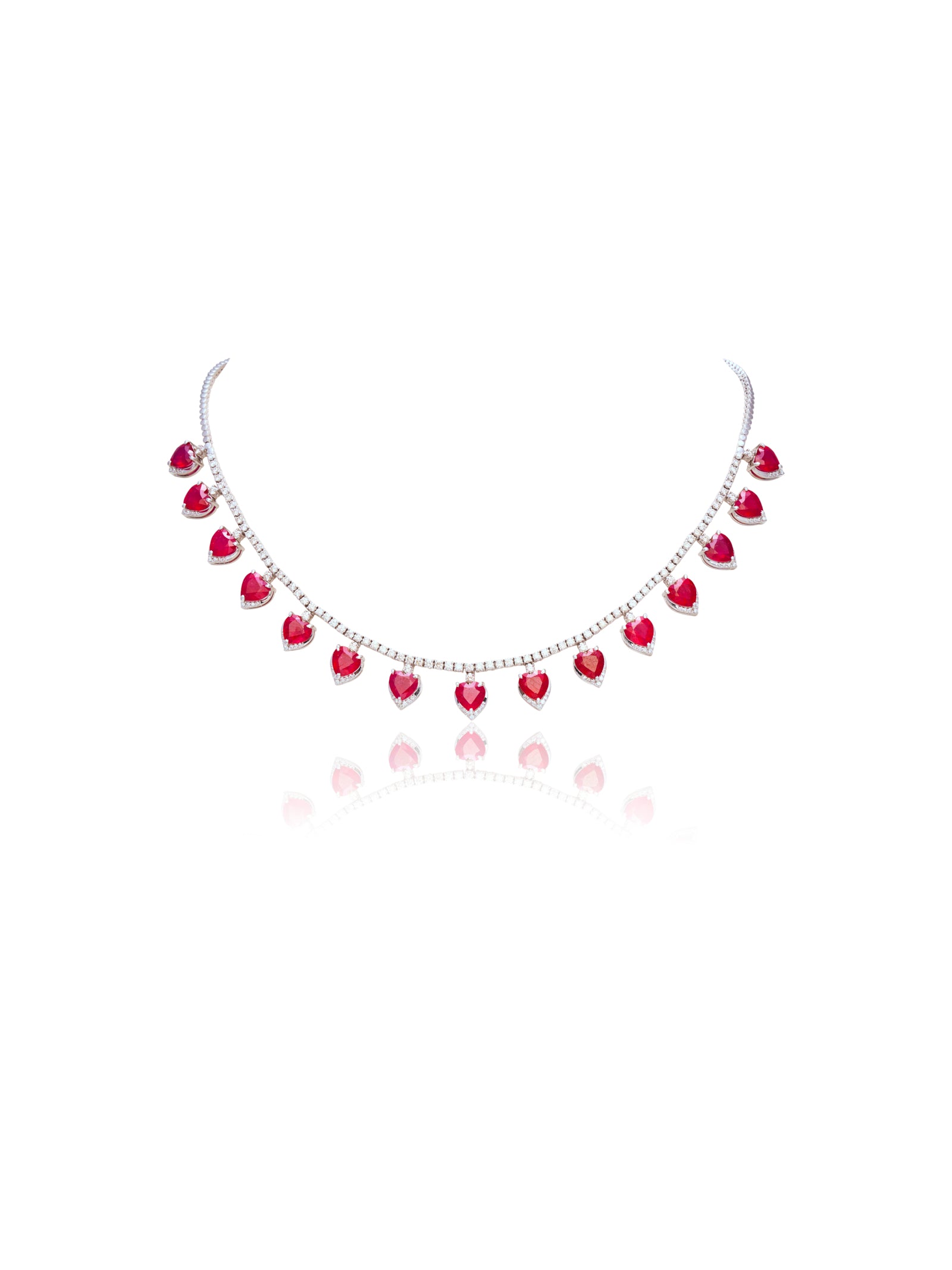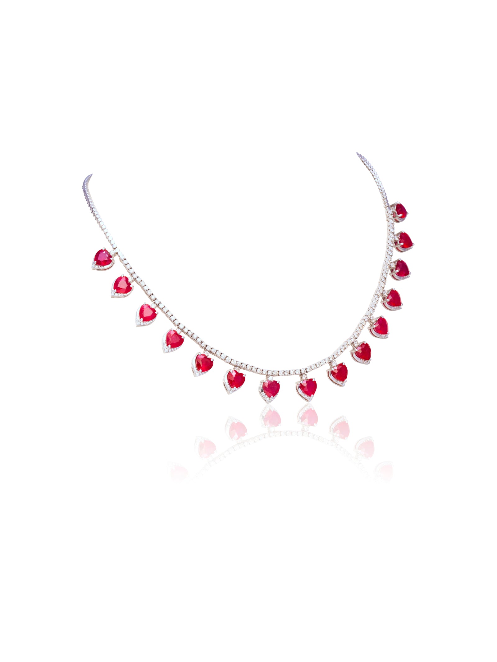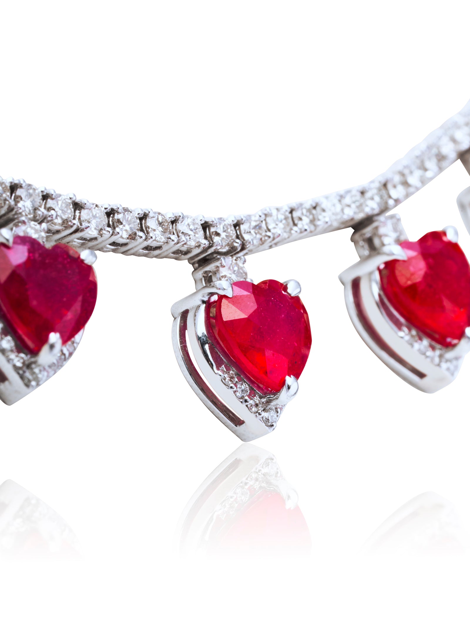 With heart-shaped rubies and round brilliant cut diamonds, this necklace captures the essence of romance and sophistication, adding fiery elegance to any look.