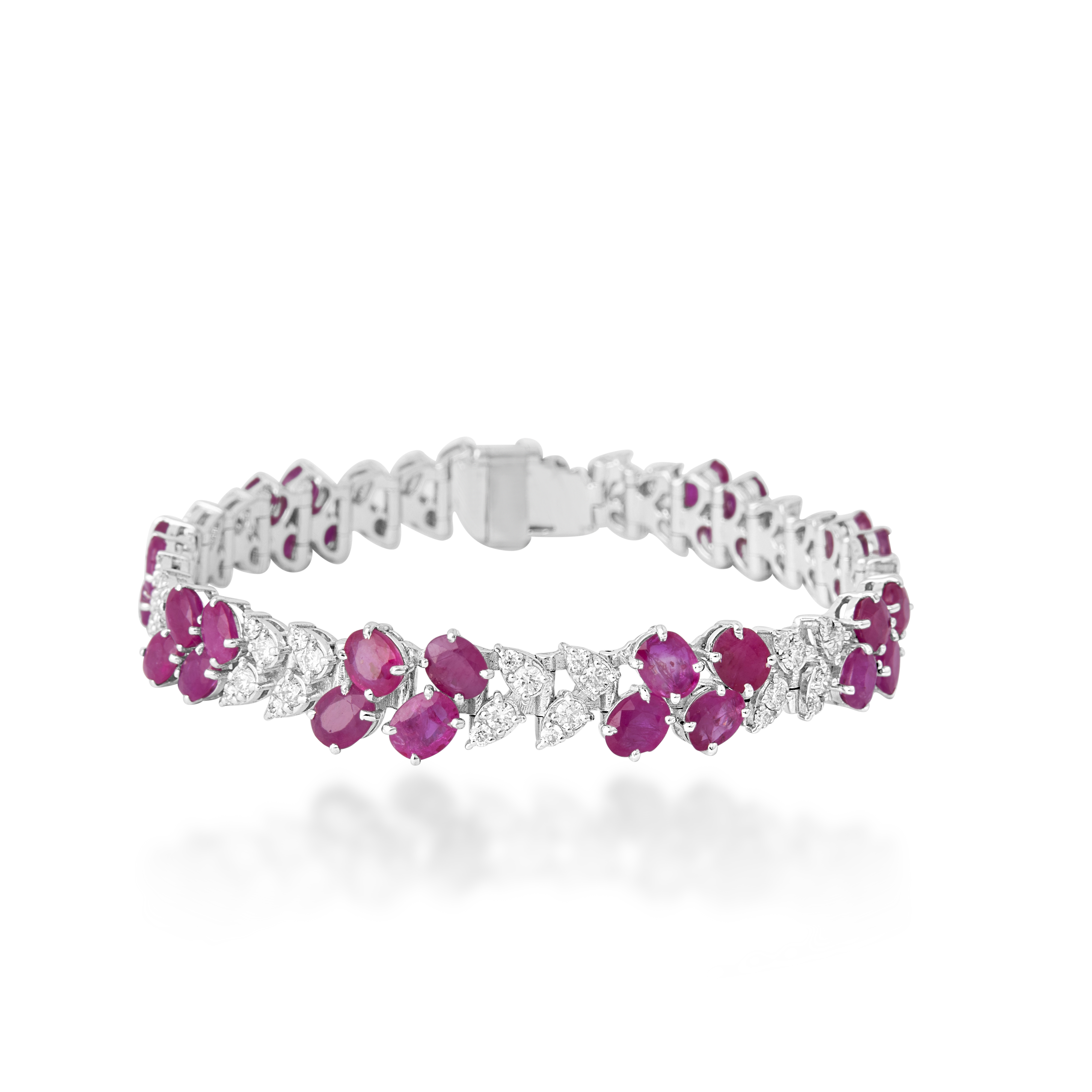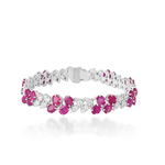 A refined bracelet set with natural rubies in rich, vivid pink-red tones, arranged in a floral-inspired rhythm. Interspersed with pear-cut diamond accents, the design balances colour and brilliance with a light, elegant touch.