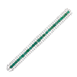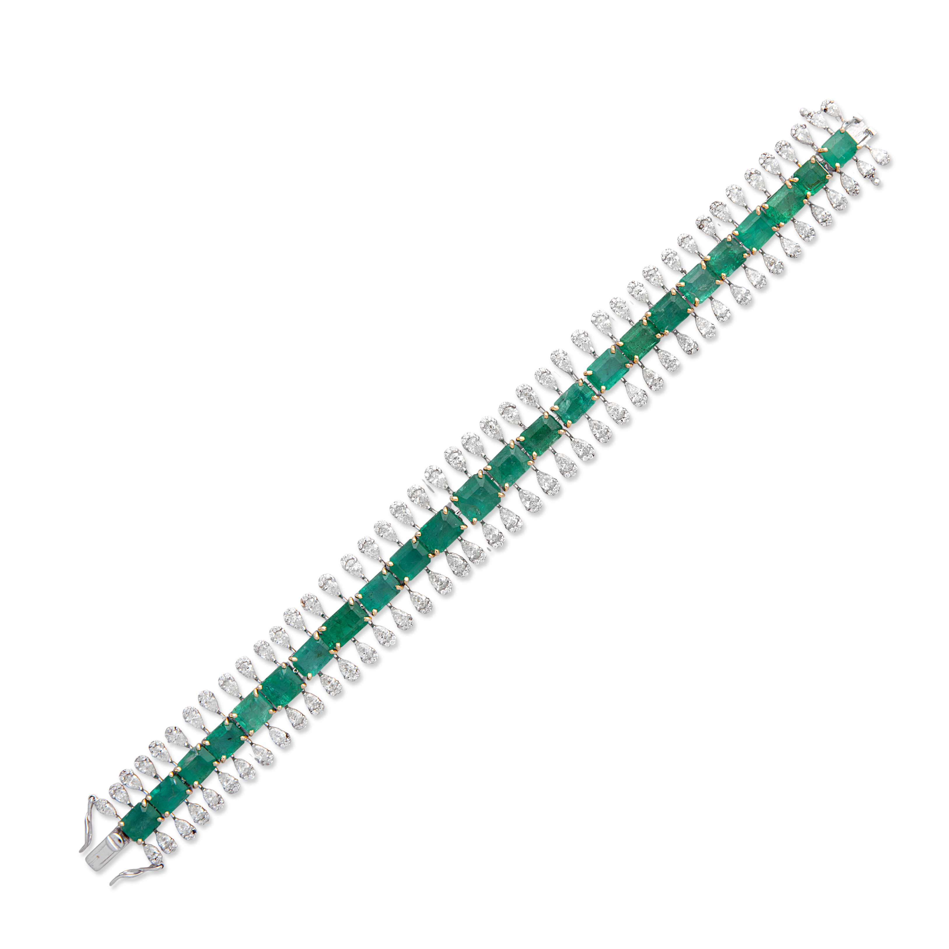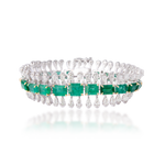 A statement bracelet set with a row of natural emeralds, framed by cascading pear-cut diamonds that create a fluid, rhythmic silhouette. The vivid green gemstones are secured with warm gold prongs, offering a refined contrast against the cool-toned metal base and shimmering diamond surround.