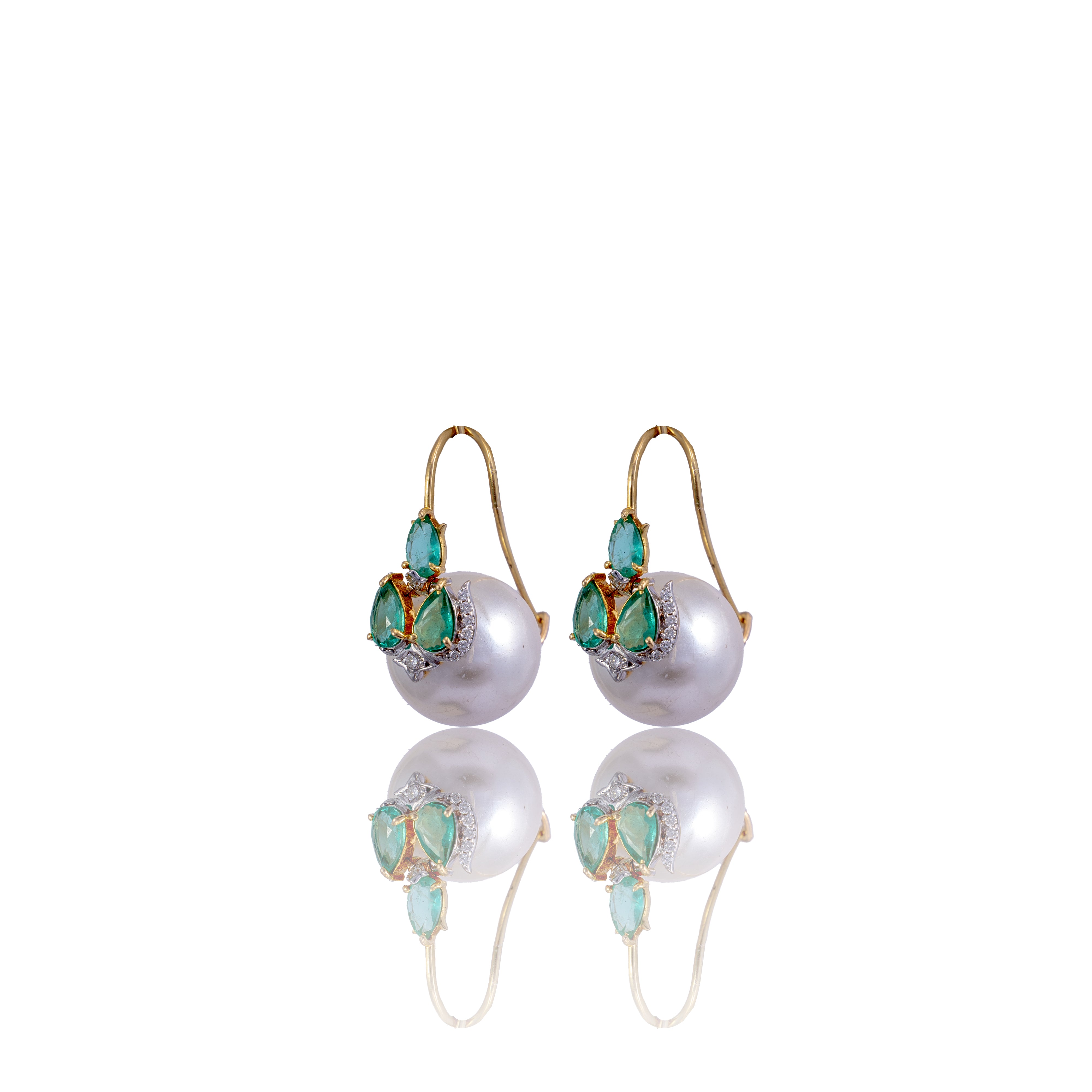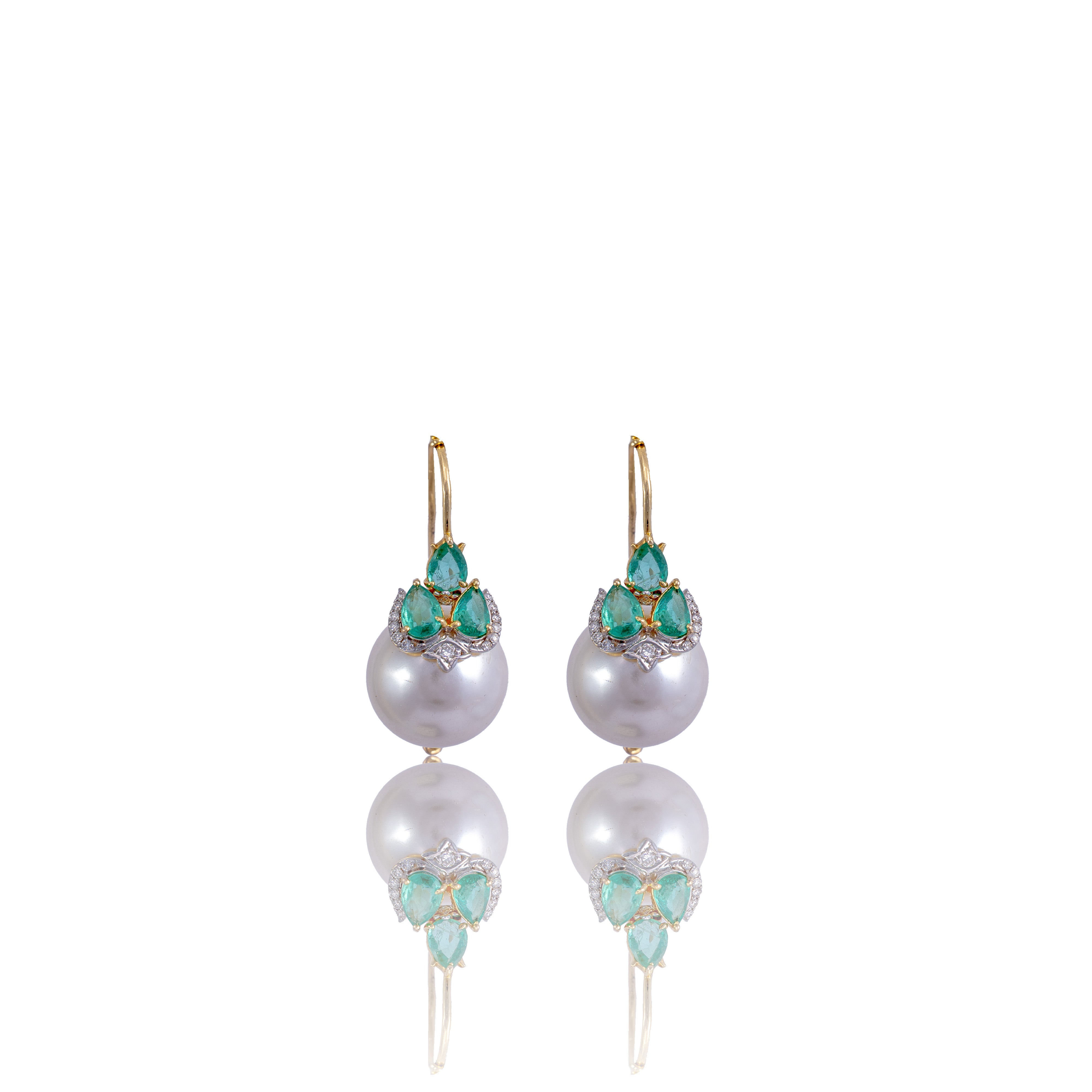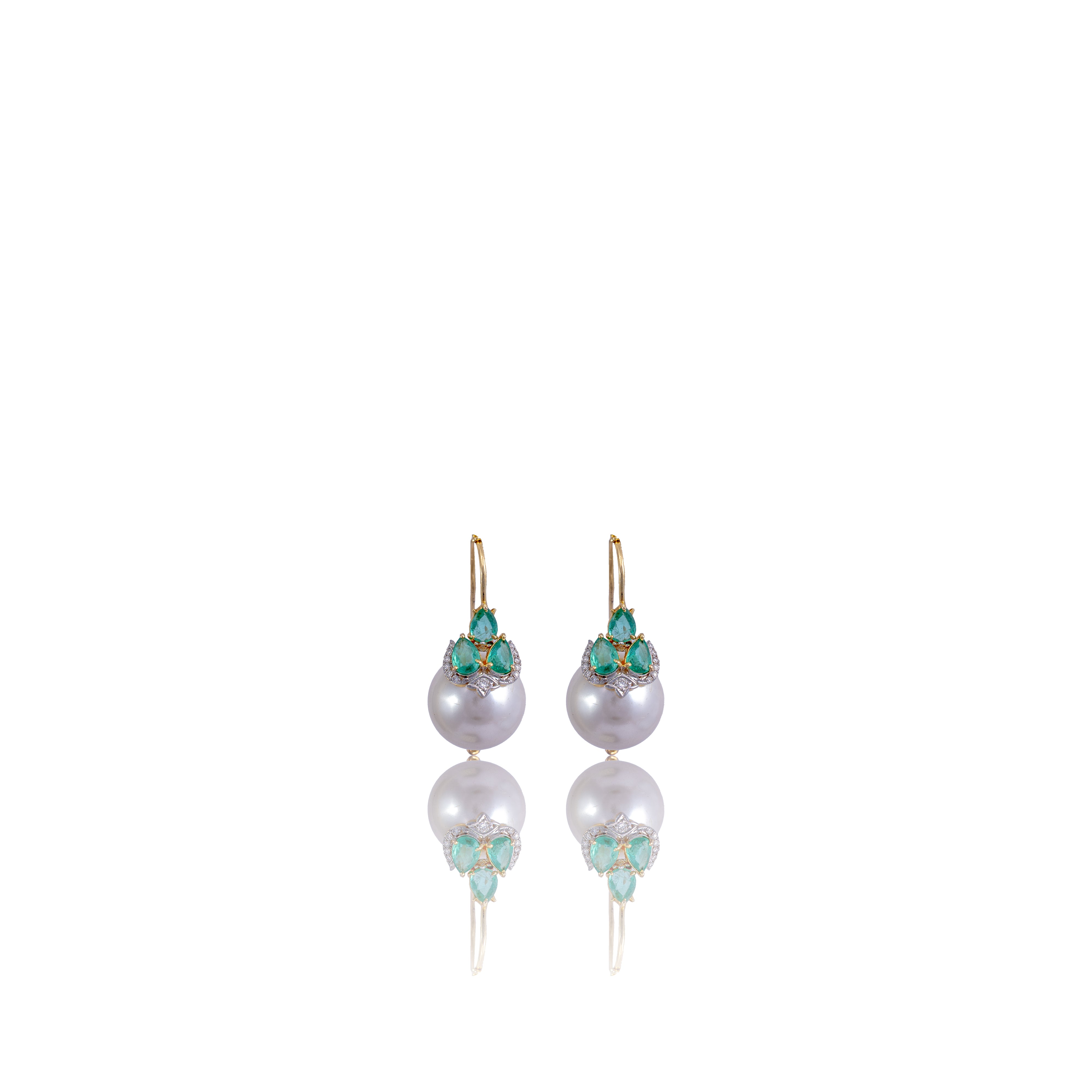 Diamond hoop earrings which have been handcrafted in 14K gold and encrusted with pear shape Zambian emeralds, round brilliant diamonds and pearls will surely elevate your simplest looks.