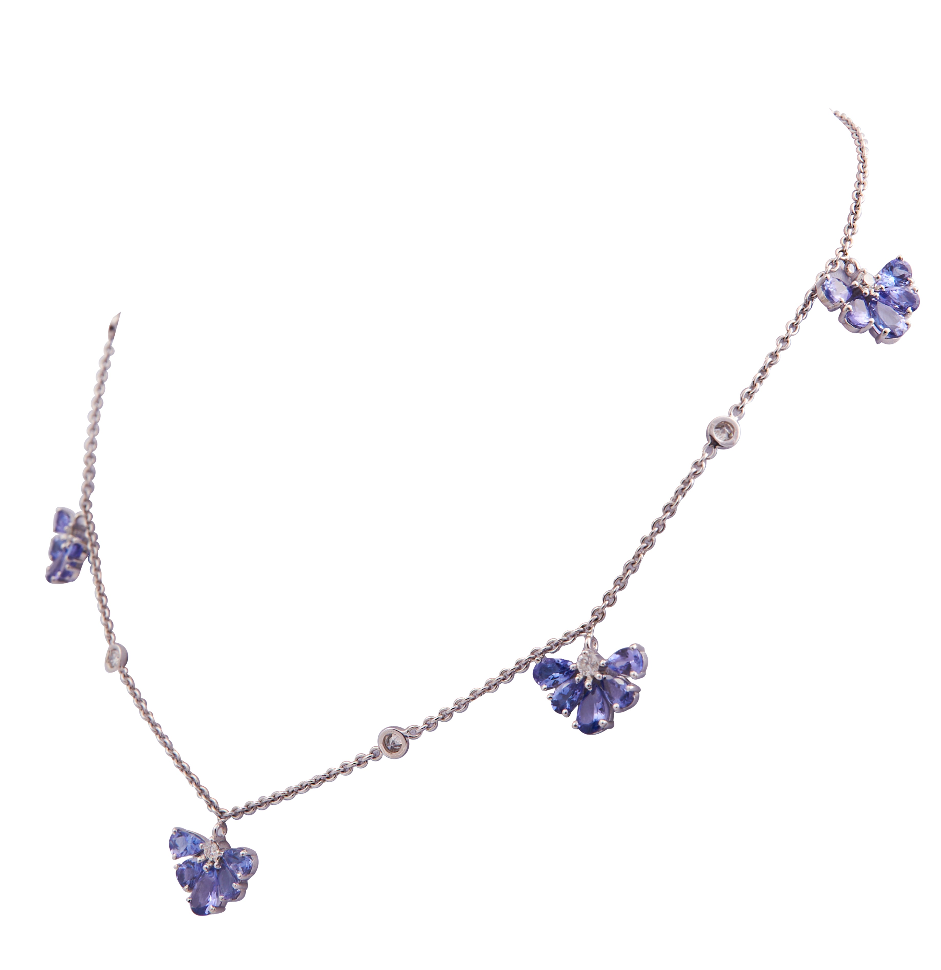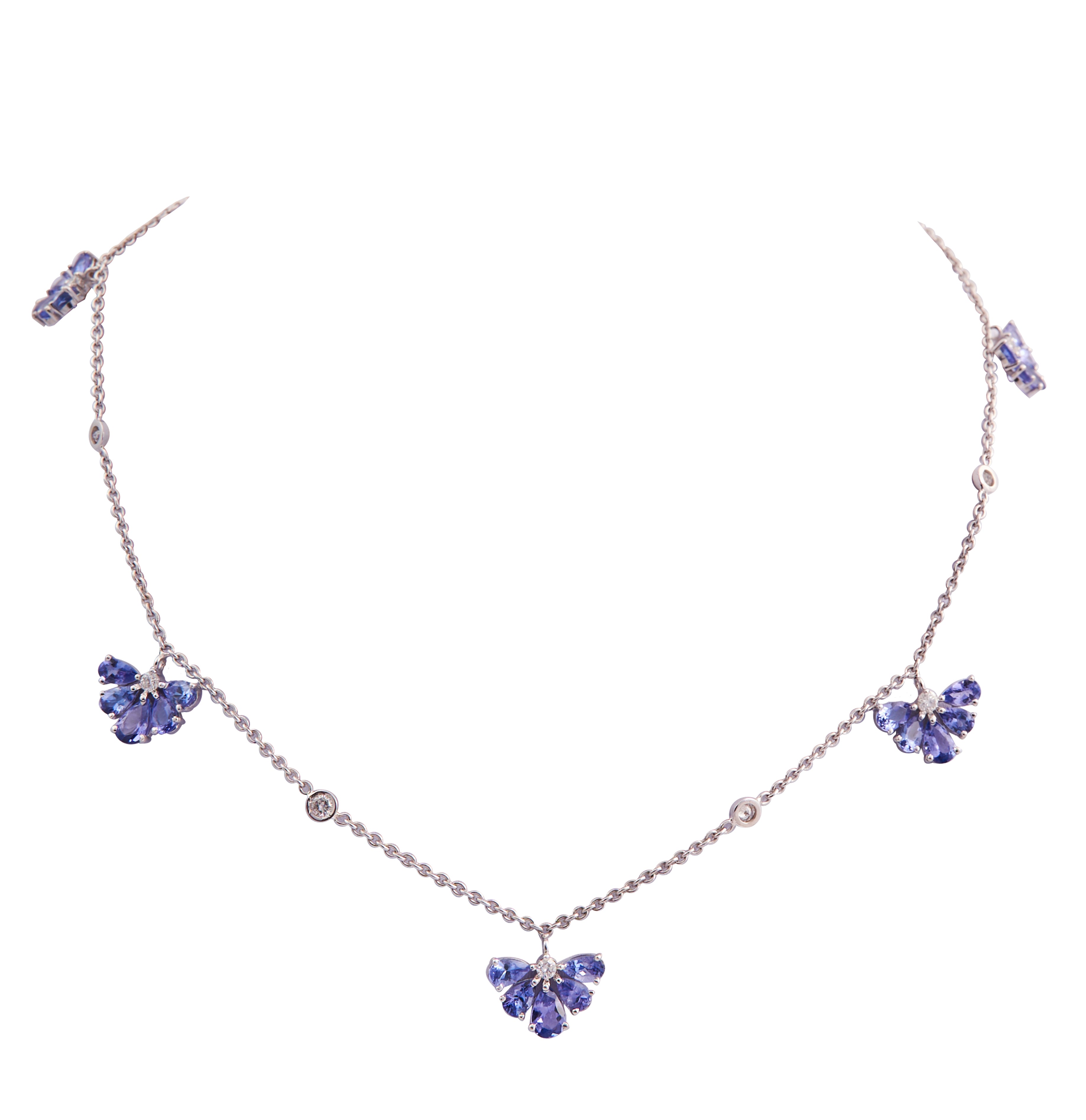 Embodying mystique and elegance, while reflecting light from every angle, immerse yourself in the beauty of this exquisite pear-shaped tanzanite necklace, embellished with an array of round brilliant-cut diamonds.