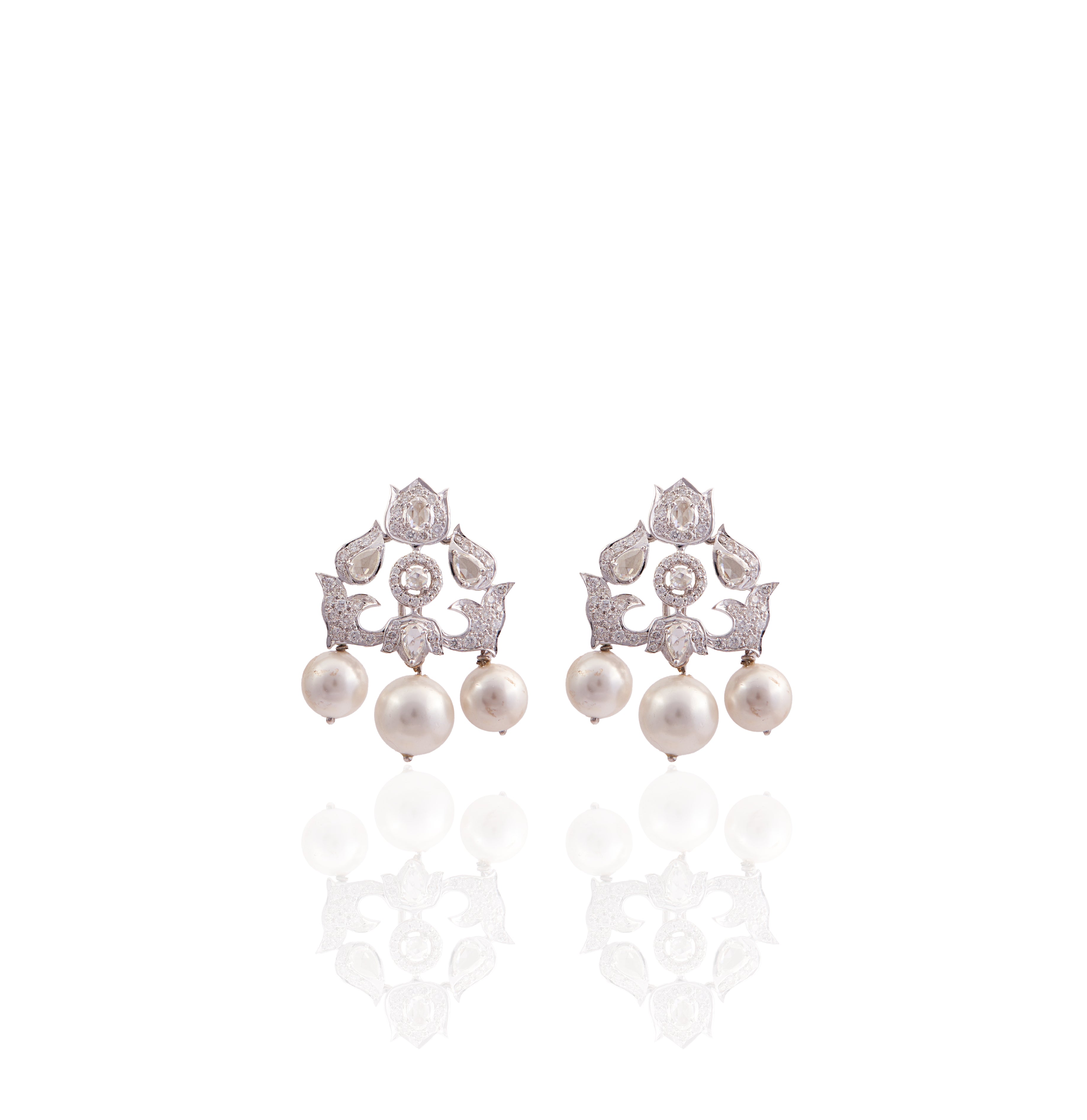 Symbols of grace and poise, set in 18K purity, these pearl earrings are adorned with a captivating blend of rose-cut and round brilliant-cut diamonds, crafted with classic sophistication and modern refinement.