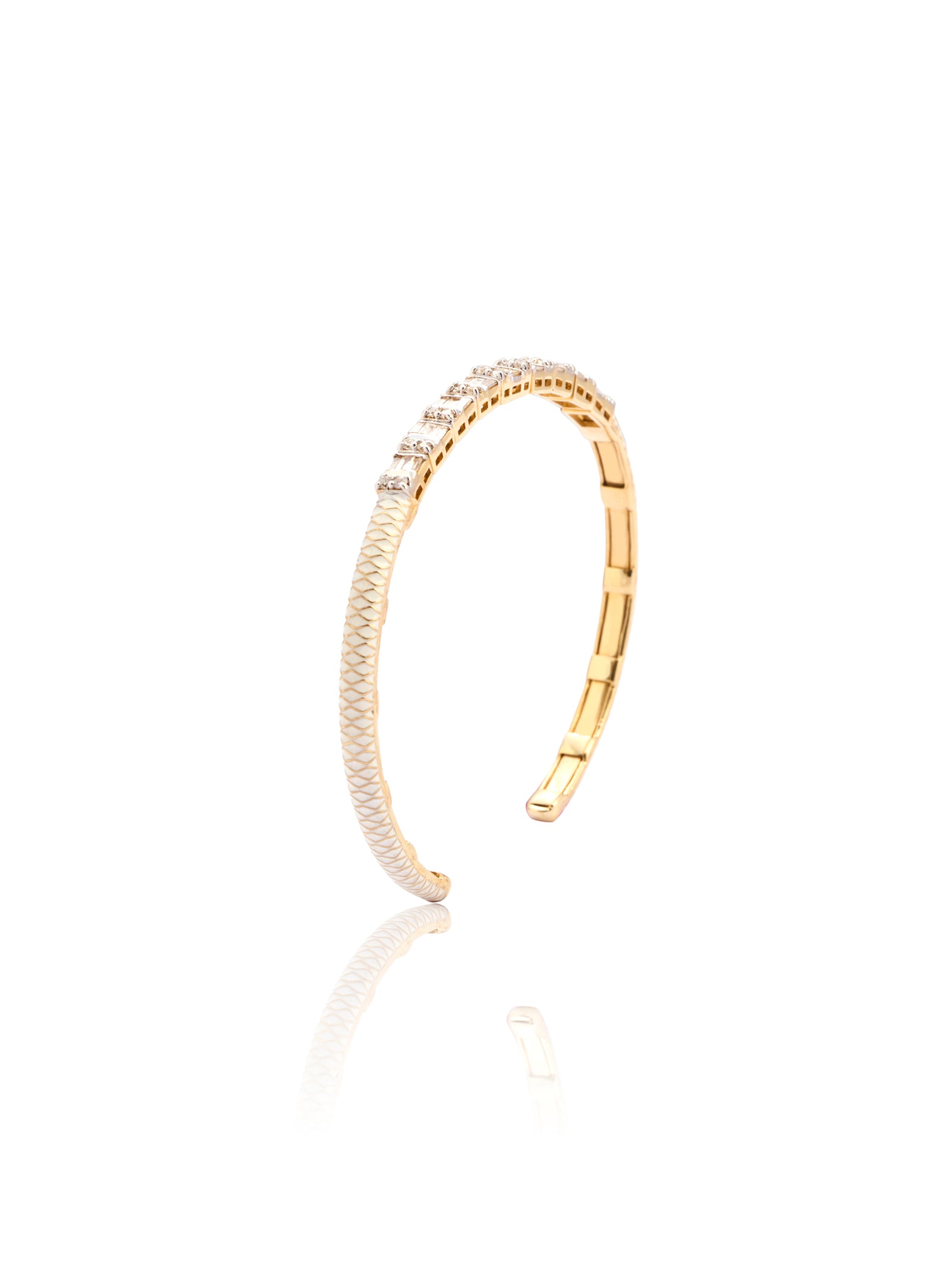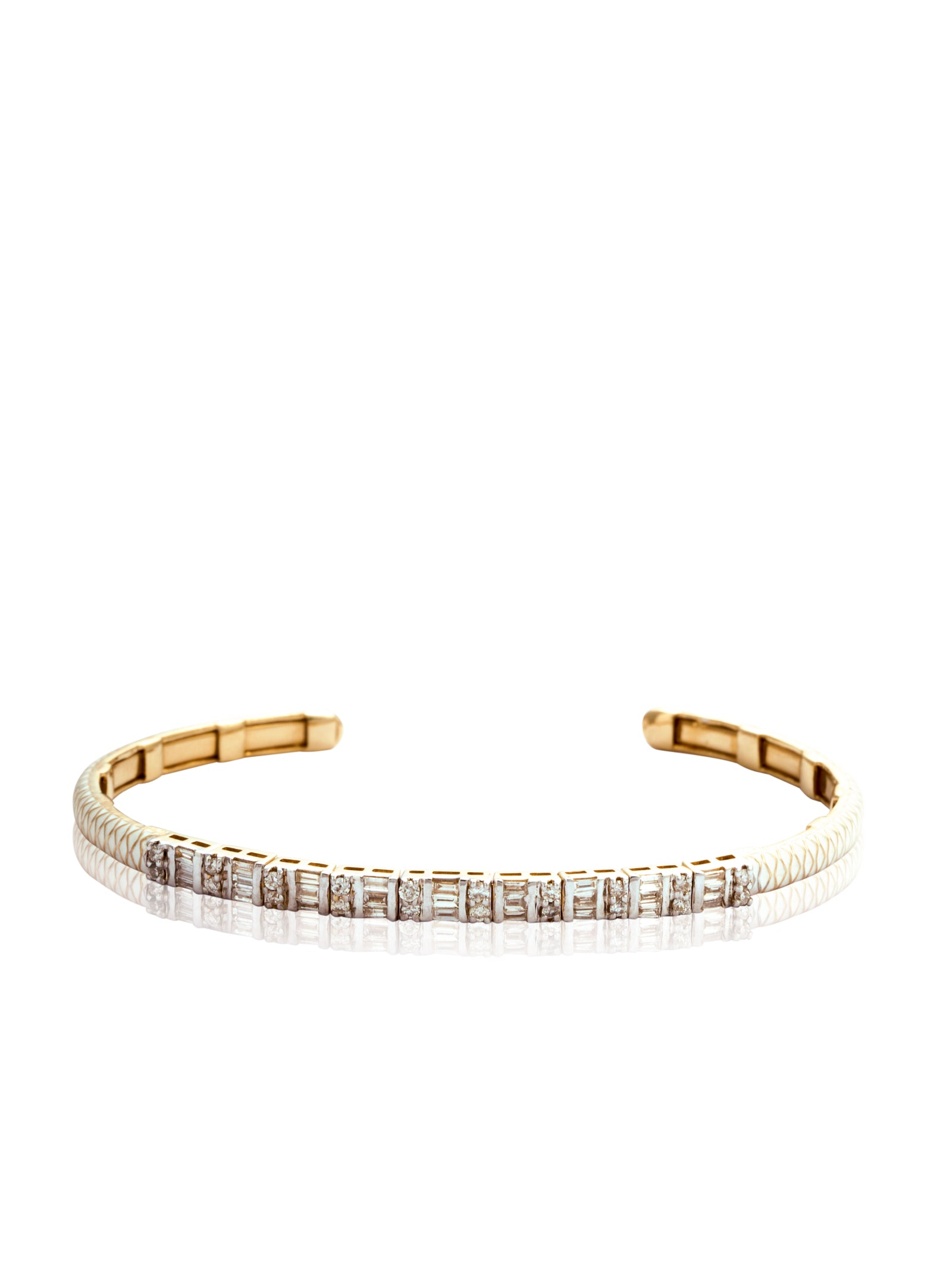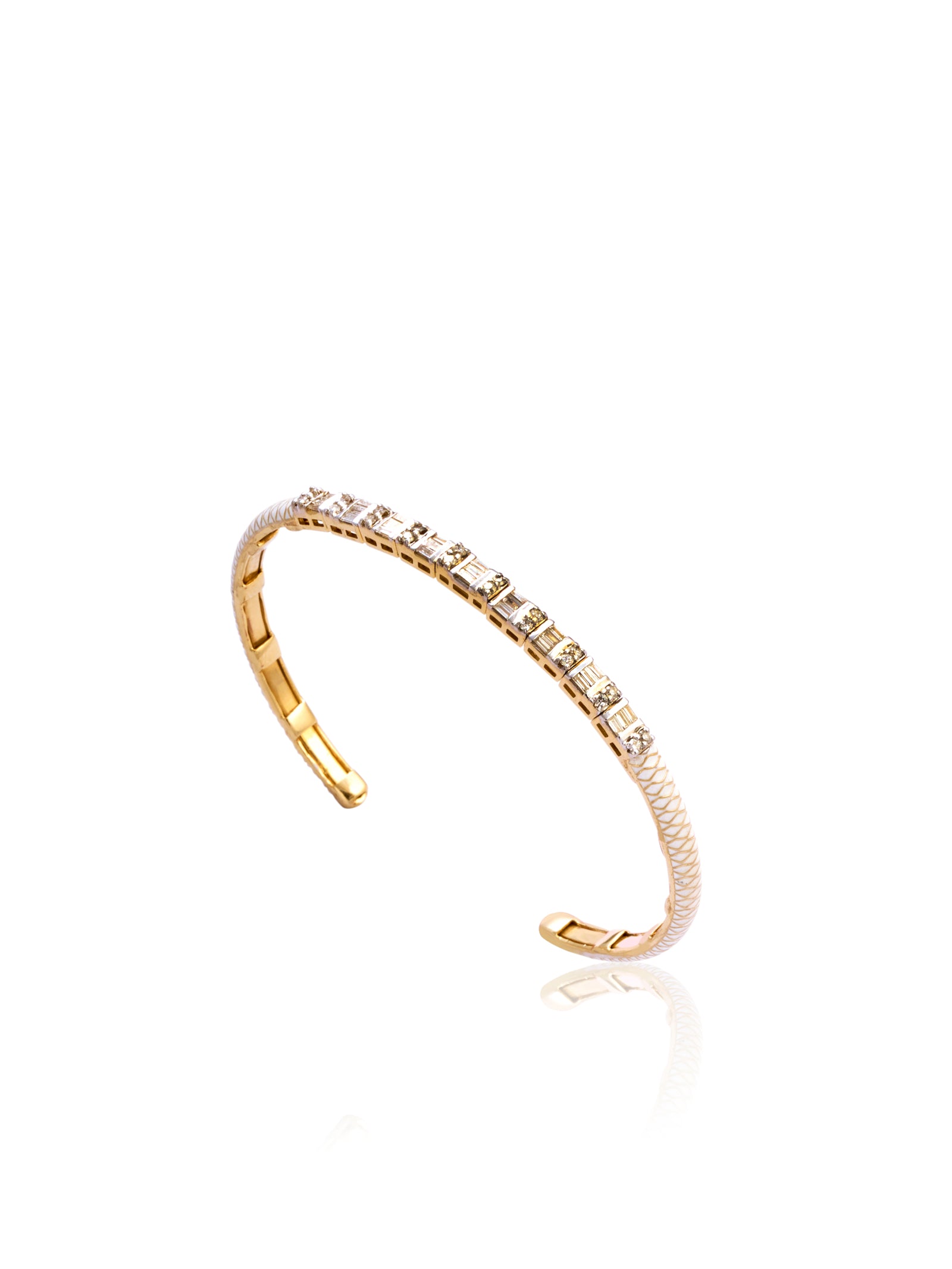 The soft elegance of white ceramic, paired with the refined brilliance of baguette and round diamonds, creates a bangle that’s both modern and timeless.
