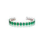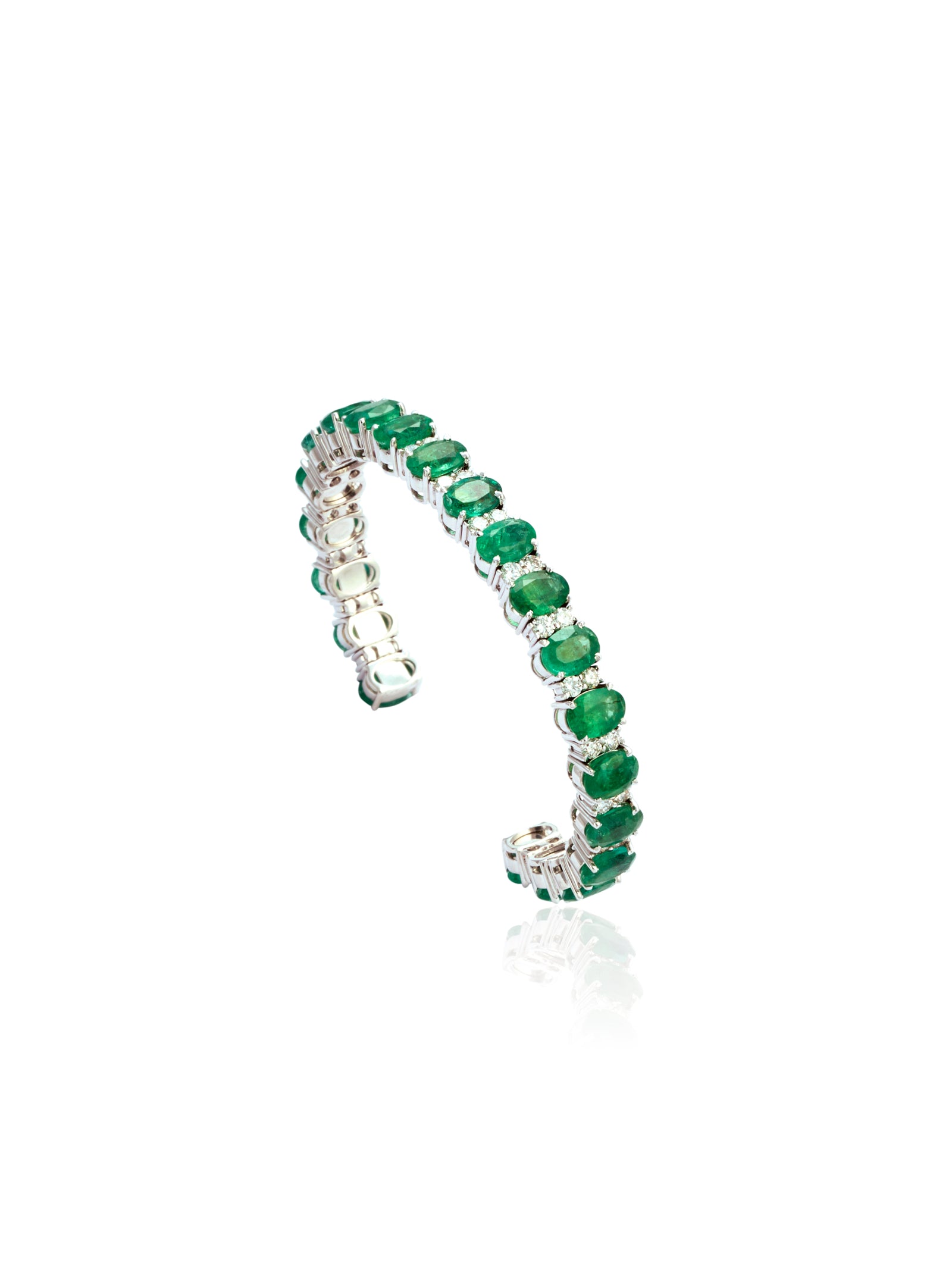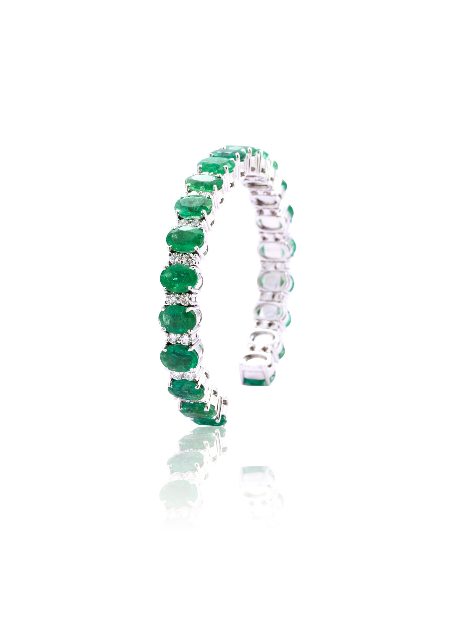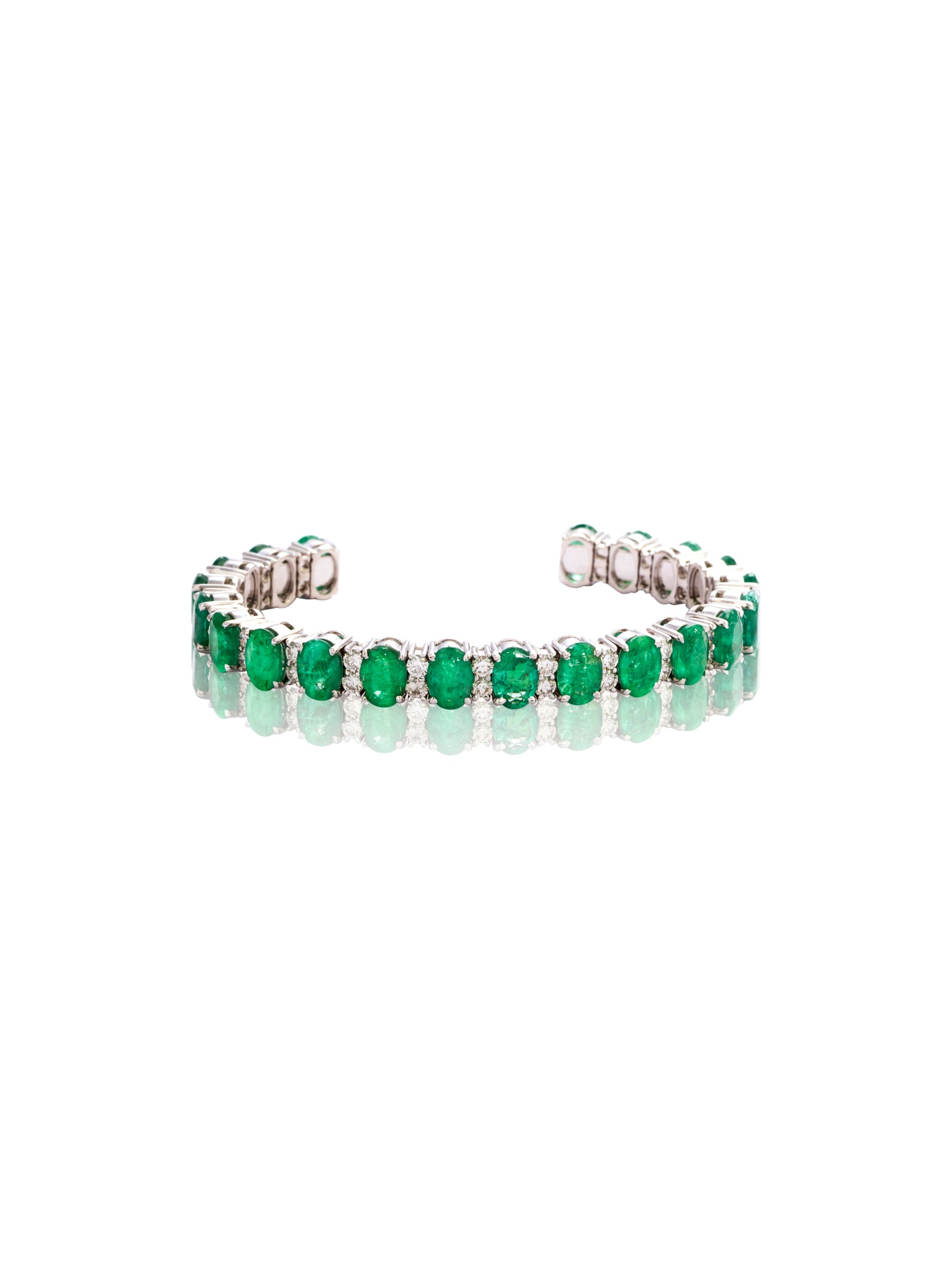 A modern take on classic elegance, this Zambian oval emerald and round brilliant-cut diamond bangle captures the essence of refined luxury.