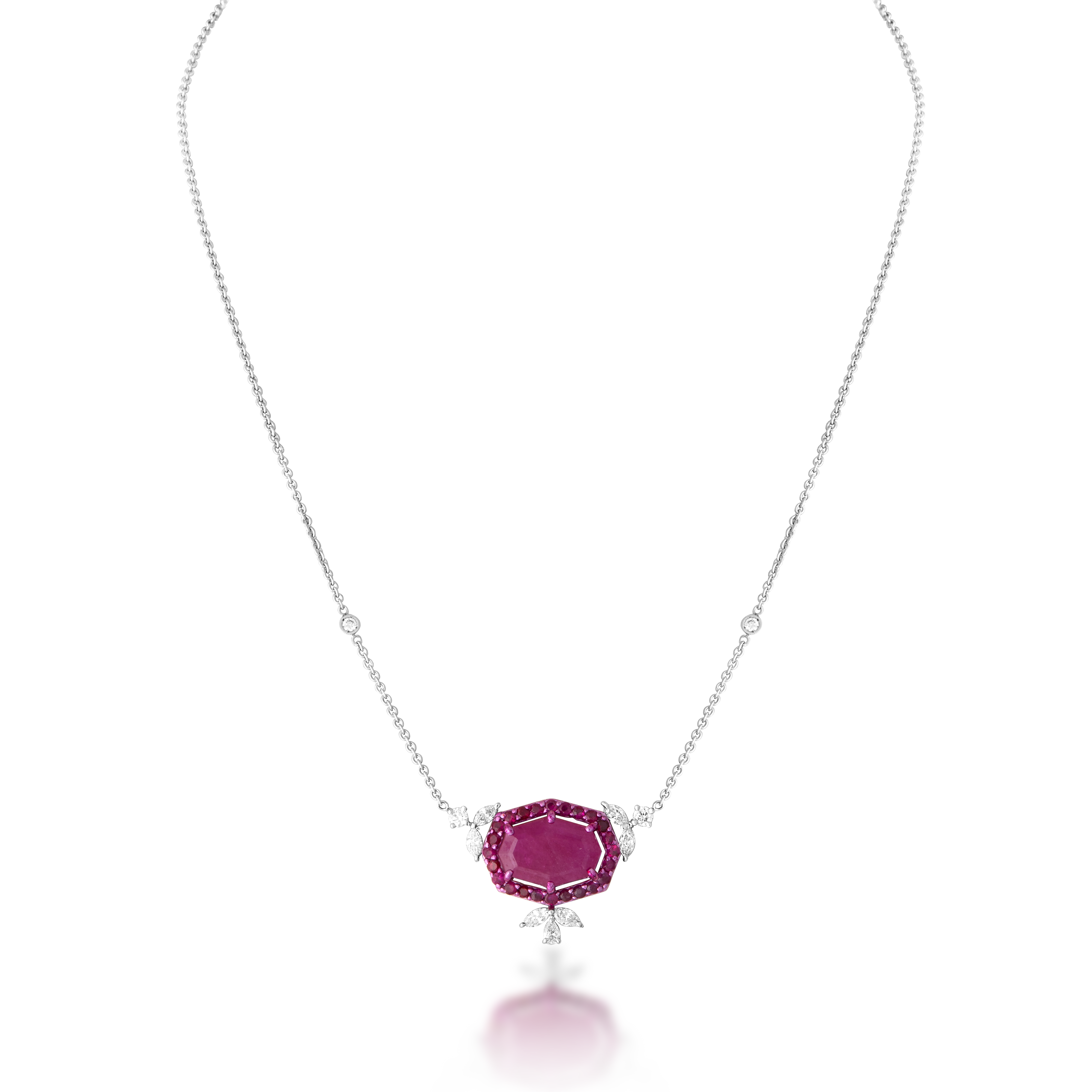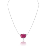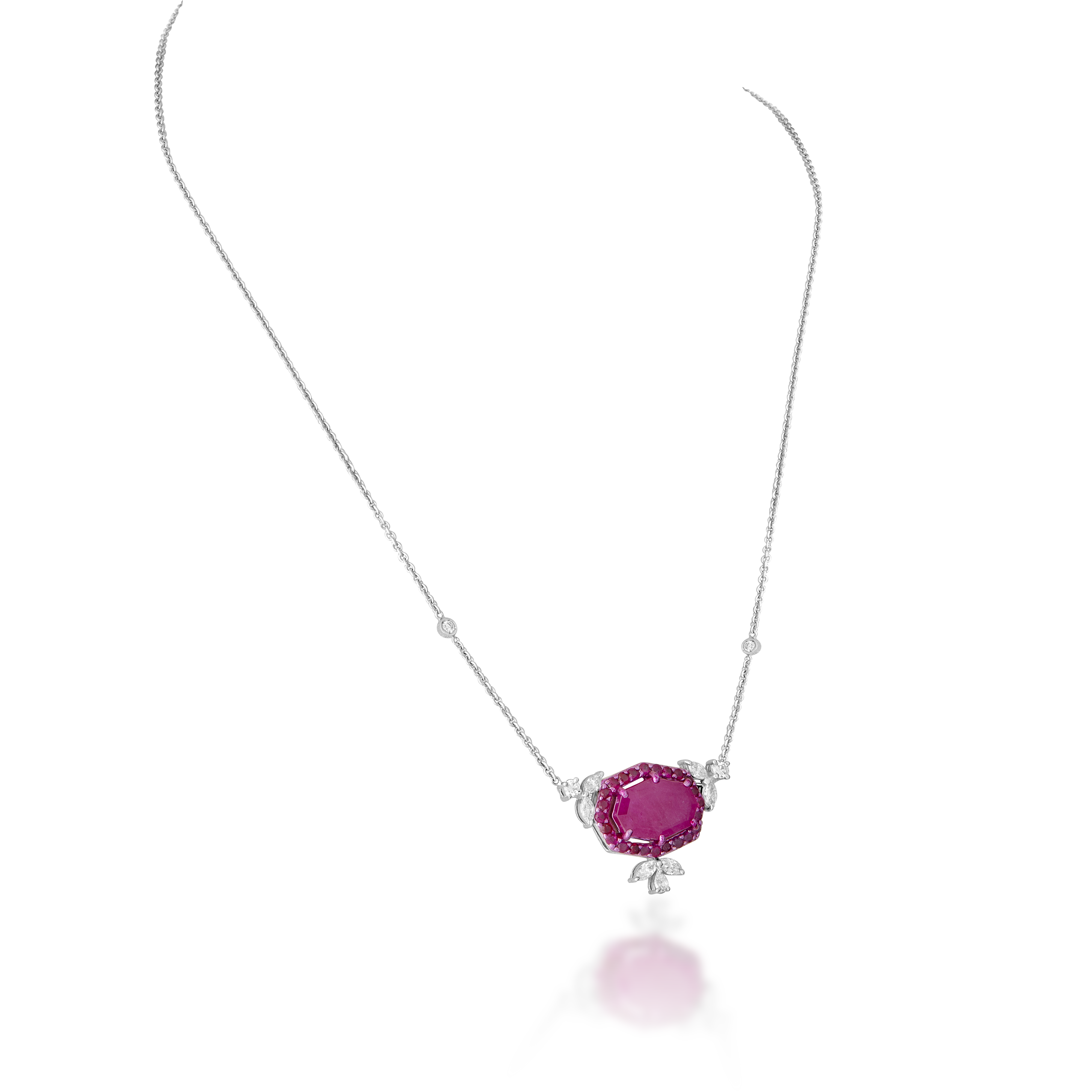 A striking necklace centred on a vivid ruby, framed by delicate diamond accents that enhance its depth and brilliance. Set along a fine, minimal chain with subtle diamond stations, the design balances bold colour with lightness and restraint.