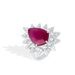 A bold statement ring centred on a richly hued natural ruby, cut in a soft, cushion-like silhouette and framed by a radiant halo of marquise and round diamonds. The vivid pink-red gemstone anchors the design, while the layered diamond surround creates a luminous, floral-inspired brilliance.